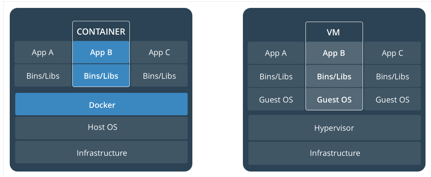 一个容器中运行原生Linux和共享主机与其它容器的内核,它运行一个独立的进程,不占用任何其它可执行文件的内存,使其轻量化。相比之下,虚拟机(VM)运行一个完整的“客户”操作系统,通过虚拟机管理程序虚拟访问主机资源。一般来说,虚拟机提供的环境比大多数应用程序需要的资源多。