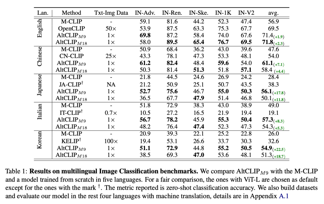 在多语言图片分类 benchmarks 上,AltCLIP-m9(早期版本,支持9种语言) 与 AltCLIP-m18 达到最优水平⬇️