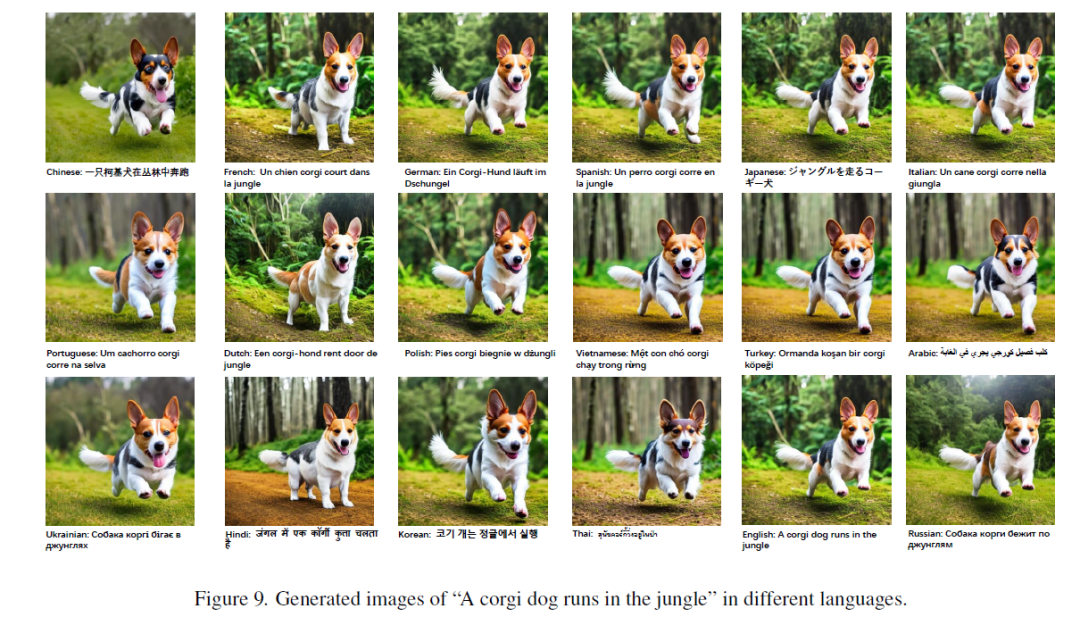更加有趣的是,在不同语言下动物的 prompt 生成的图片细节也有差异。如下图所示,虽然不同语言生成的图片整体上具有高度一致性,但画面背景和柯基的五官细节都有细微差异。
