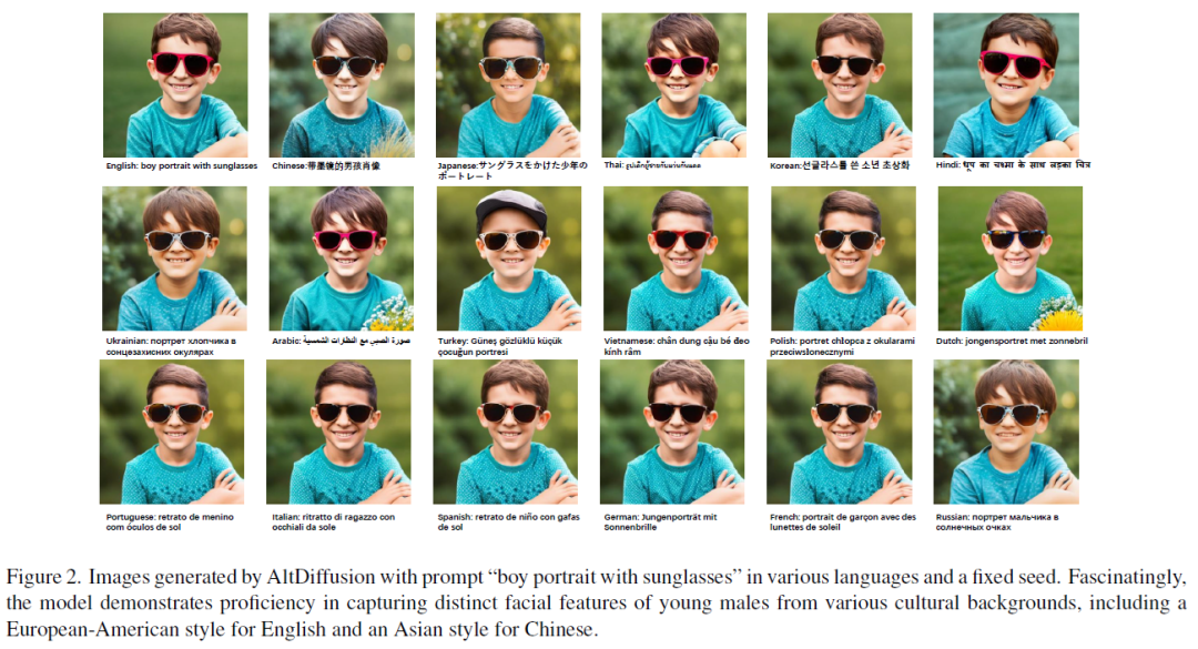 AltDiffusion-m18 从多语言的数据中学到了不同语言的偏置,帮助用户越过语言翻译门槛、绕过文化转译,减少了语言背后文化信息的丢失。如下图所示,中文、日文 Prompt 生成的小男孩的脸部轮廓更加“亚洲风”,而英语及其他欧洲地区语言 prompt 生成小男孩则更加“欧美风”。
