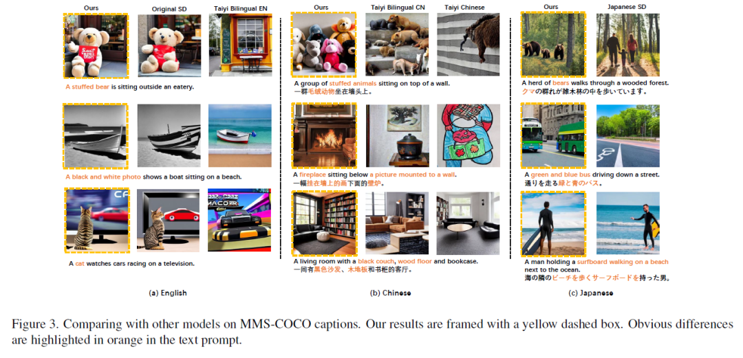 上图(a)中 AltDiffusion-m18 可以生成跟原始 Stable Diffusion 高度一致的结果,并且在 prompt 理解上优于国内其他中英双语模型,例如:"A stuffed bear", "A black and white photo", "cat"等在国内其他中英双语模型中生成失败的概念可以在 AltDiffusion 中成功生成。同样的现象在中文和日文中也有出现。