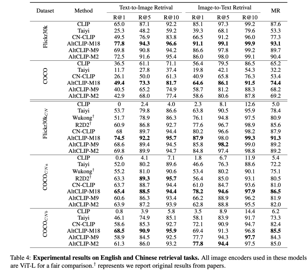 最新评测结果显示,AltCLIP-m18 在中英文 zero-shot(零样本)检索任务上超过 CLIP 达到了最优水平⬇️