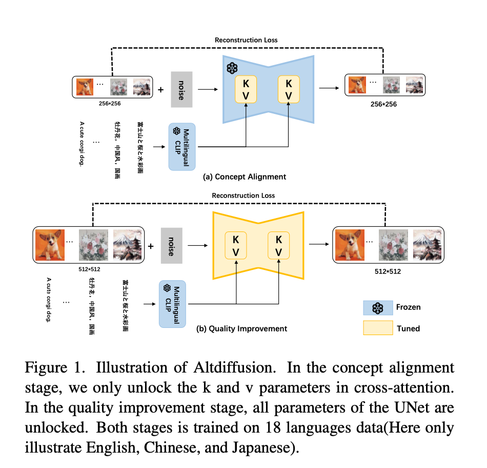 而 AltDiffusion-m18 基于 Stable Diffusion v2.1 训练。Stable Diffusion v2.1 新的语言塔为 OpenCLIP 的倒二层,因此,全新的 AltCLIP 以 OpenCLIP 的倒二层作为蒸馏目标重新训练,并且在 m9 的基础上将仅对 Unet 中 CrossAttention 层 K,V 矩阵微调,扩展成两阶段的训练方式,如下图所示: