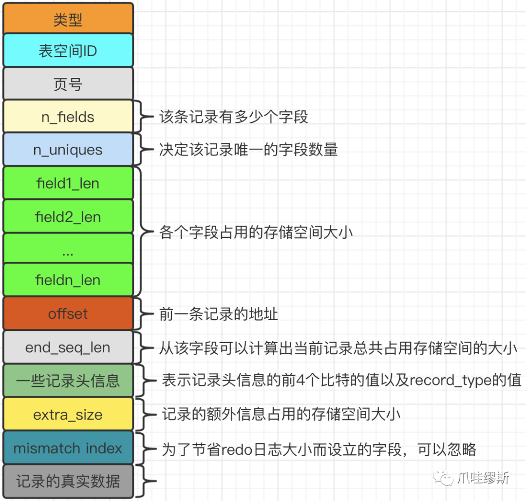 【注】只要在【数据占用的字节数】处填入1、2、4、8这些数字,就可以分别替代MLOG_1BYTE、MLOG_2BYTE、MLOG_4BYTE、MLOG_8BYTE这些类型的redo日志。但是,为了节省空间,所以,才特殊定义了这4个类型。