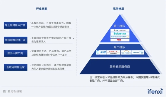 与此同时,HR数字化市场竞争日趋激烈,大量行业玩家争相涌入、下水掘金。从厂商“缘起”来看,HR数字化市场已经形成四类主要玩家:专业领域新兴厂商以肯耐珂萨、Moka为代表,具备低代码、云原生技术实力,拥有一体化产品能力或深耕某个垂直模块;传统综合软件厂商以金蝶、用友为代表,多面向大中型客户做定制化产品开发,近年来逐步走向云化;以workday为代表的国外大牌厂商管理理念先进、产品比较成熟,但产品的功能性和体验感对于中国用户并不是很友好;飞书、钉钉等跨界玩家以协同办公为抓手,通过构建底层能力引入更多细分领域的生态伙伴。