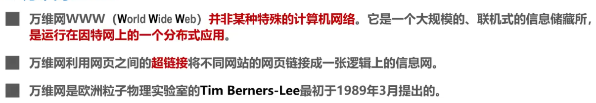 - 20世纪90年代将因特网带入千家万户的万维网WWW