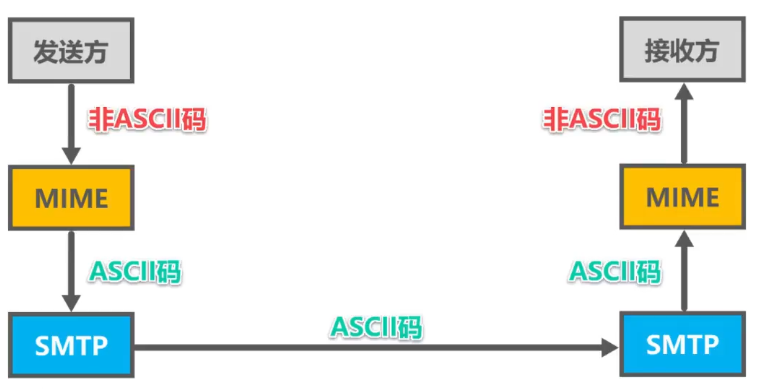 - SMTP协议只能传送ASCII码文本数据,不能传送可执行文件或其他的二进制对象。