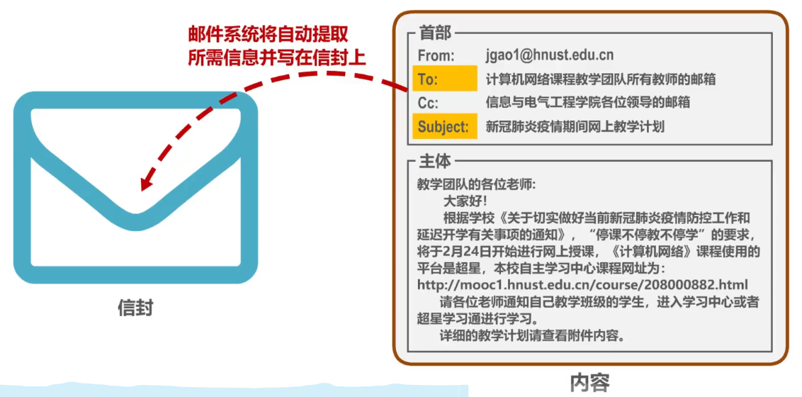 - 电子邮件的信息格式并不是SMTP定义的,而是在RFC 822中单独定义的。这个RFC文档已在2008年更新为RFC 5322。一个电子邮件有信封和内容两部分。而内容又由首部和主体两部分构成。
