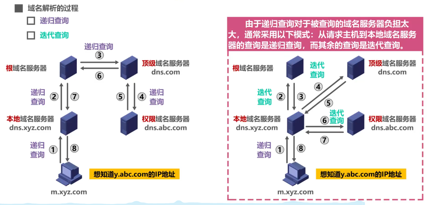 - 为了提高DNS的查询效率,并减轻根域名服务器的负荷和减少因特网上的DNS查询报文数量,在域名服务器中广泛地使用了高速缓存,高速缓存用来存放最近查询过的域名以及从何处获得域名映射信息的记录。