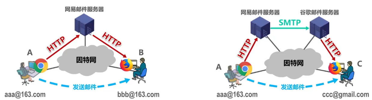 - 这种工作模式在用户浏览器与邮件服务器之间使用HTTP协议,而邮件服务器之间使用SMTP协议。