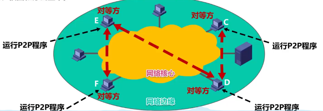 - 在P2P方式中,没有固定的服务请求者和服务提供者,分部在网络边缘的各端系统中的应用进程是对等的,被称为对等方。对等方相互之间直接通信,每个对等方既是服务的请求者,又是服务的提供者。