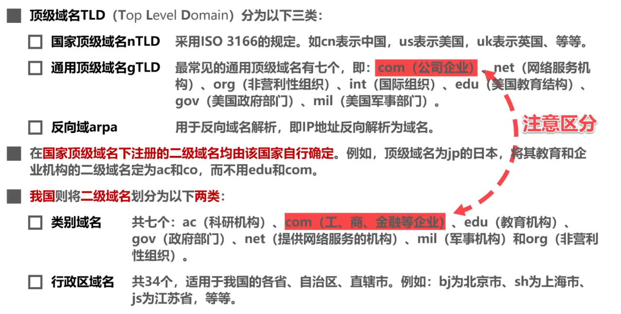- 各级域名由其上一级的域名管理机构管理,而最高的顶级域名则是由因特网名称与数字地址分配机构ICANN进行管理。