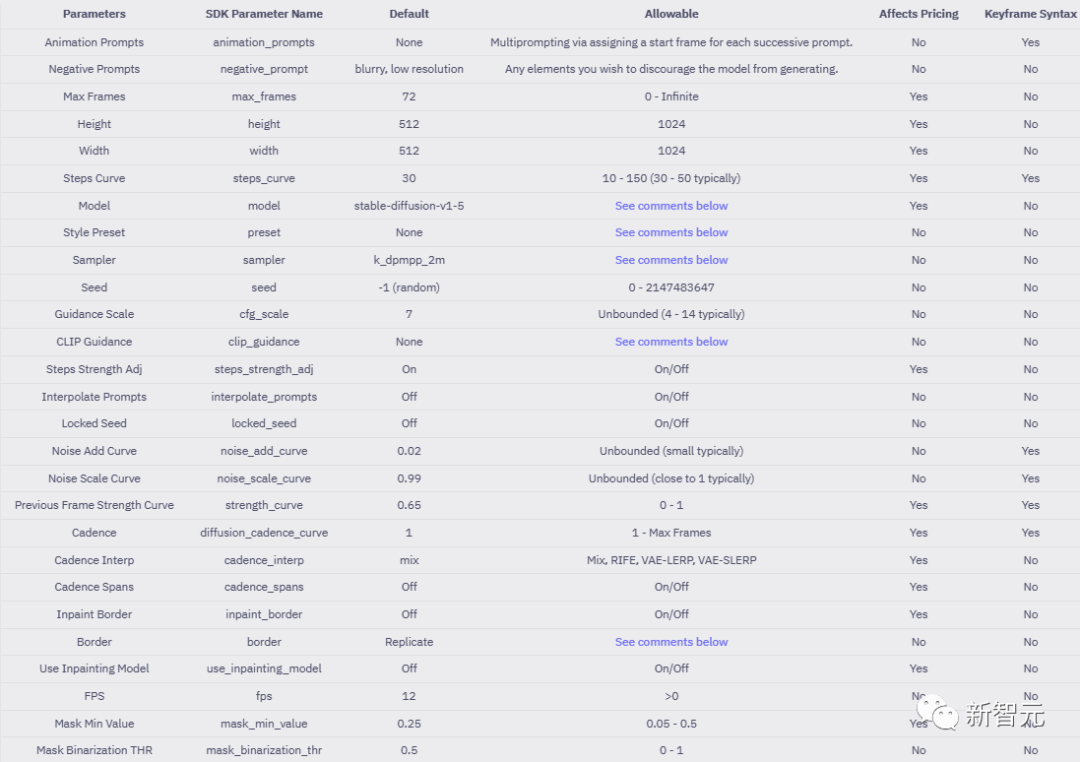 但是其他的参数也会影响价格,官方给了一个表来说明支持调整的参数,以及是否会影响到生成动画的价格。