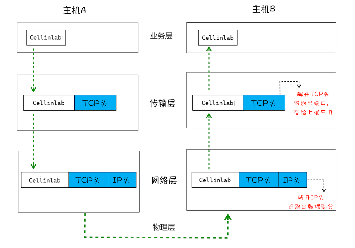 - 最终,含有 “Cellinlab” 的数据包到达 主机 B 的 业务层