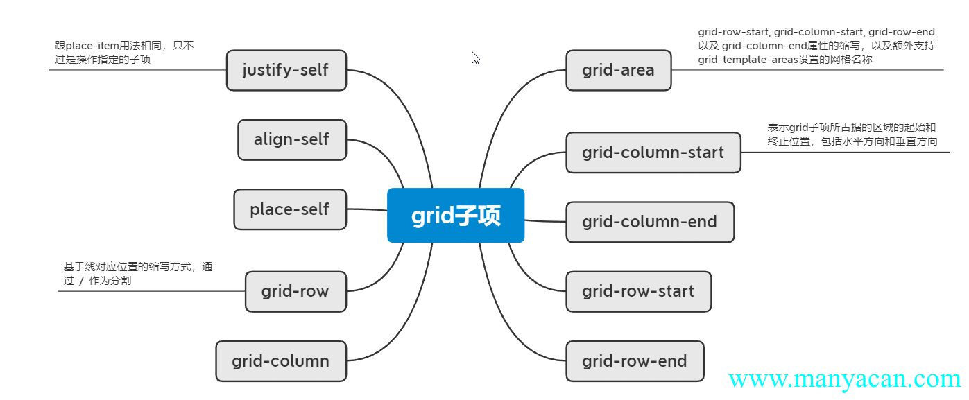 grid-column-start: col1;跟place-item用法相同,只不过是place-item是grid容器的属性,针对全部子元素都生效,place-self是子元素的属性,操作指定的子项。