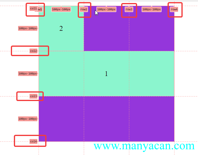 grid-column/row-start/end的设置方式有两种,第一种: