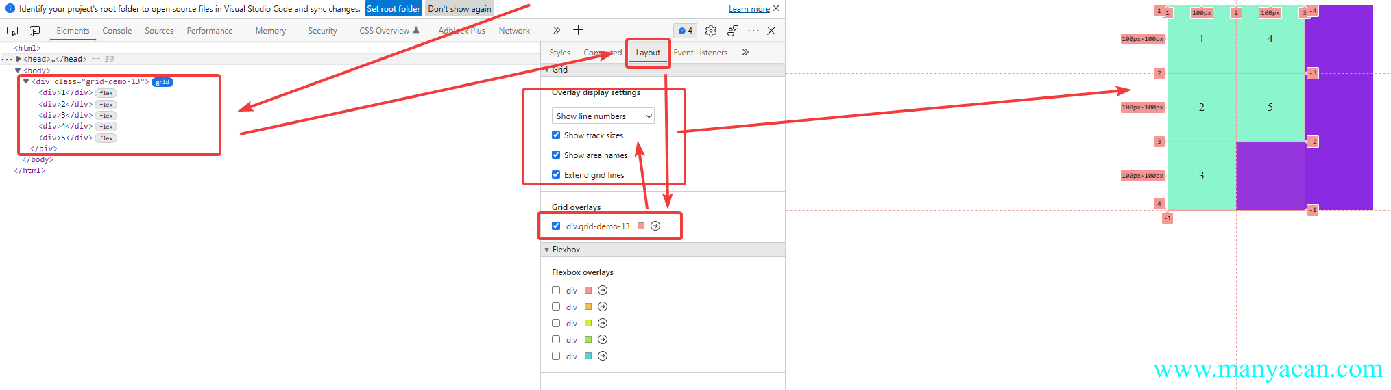 浏览器调试窗口显示grid子元素名称和分割线的序号