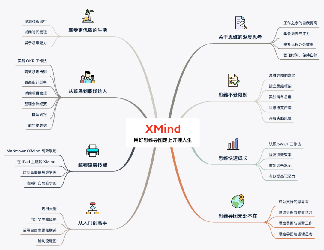 思维导图是近十年或者二十年最值得探索的领域之一,而 XMind 它不仅是效率工具,更代表着一种思考方式,但它并不能代替你去思考,却能在你灵感枯竭,缺乏逻辑时给到你连续思考的动力,将你的想法表现出来,逐渐地,这会成为一种更易成功的习惯。