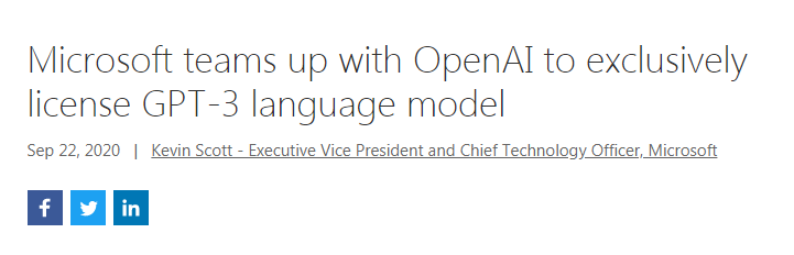 去年9月,微软从OpenAI手里拿过了GPT-3的独家授权,微软执行副总裁兼 CTO Kevin Scott 表示:「让最前沿的人工智能研究走向民主」!