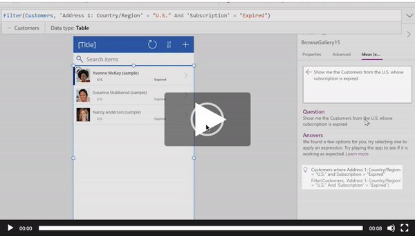 比如,我们想实现一个「找到所有在美国订阅过期的用户」的指令,过去在Power Fx上,我们需要构建一个Power Fx语句来实现查找,但现在有了GPT-3,我们只需要把我们的需求以正常的语言表达输入进去,它就可以直接帮你翻译成Power Fx的代码语句,比如像下面图片显示的一样。