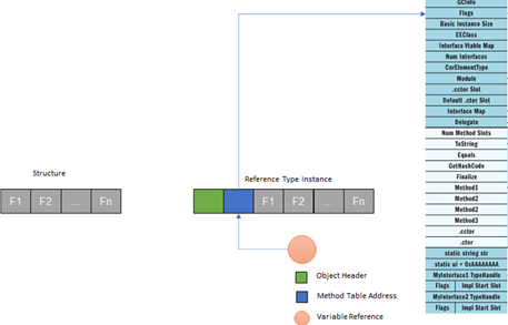 对于完全相同的数据成员,引用类型和子类型的实例所占的字节数也是不同的。如下图所示,值类型实例的字节序列全部用来存储它的字段成员。对于引用类型的实例来说,在字段字节序列前面还存储了类型对应方法表(Method Table)的地址。方法表几乎提供了描述类型的所有元数据,我们正是利用这个引用来确定实例属于何种类型。在最前面,还具有额外的字节,我们将其称为Object Header,它不仅仅用来存储对象的锁定状态,哈希值也可以缓存在这里。当我们创建了一个引用类型变量时,这个变量并不是指向实例所占内存的首字节,而是存放方法表地址的地方。