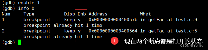(gdb) enable 断点编号 //打开断点
