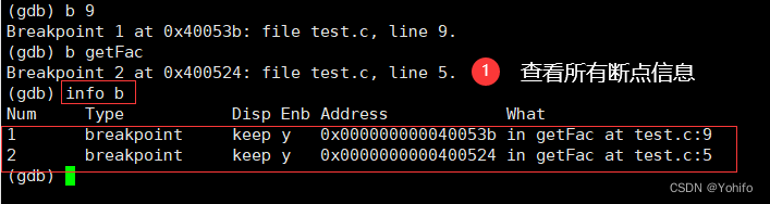 指令 info b 可以搜索所有断点,并展示其详细信息