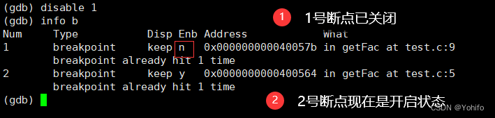 (gdb) disable 断点编号 //关闭断点