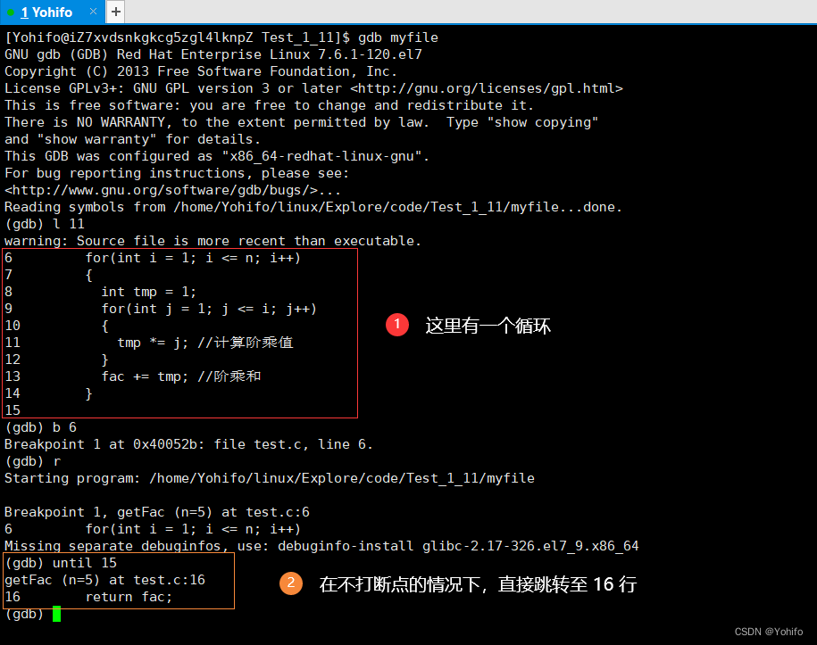 (gdb) until 行号 //跳转至指定行