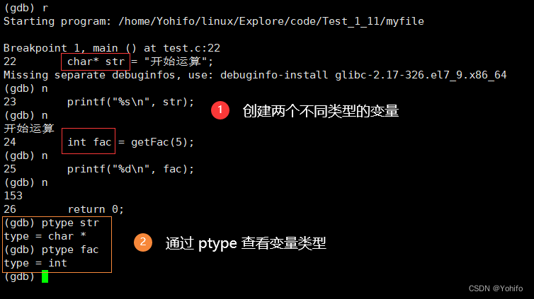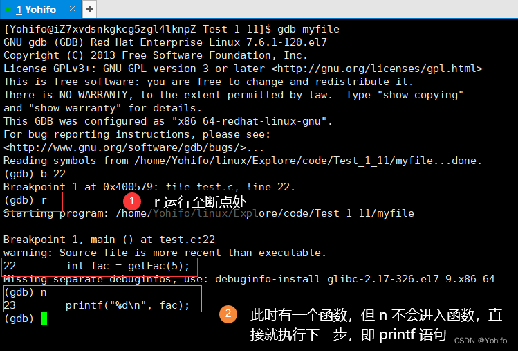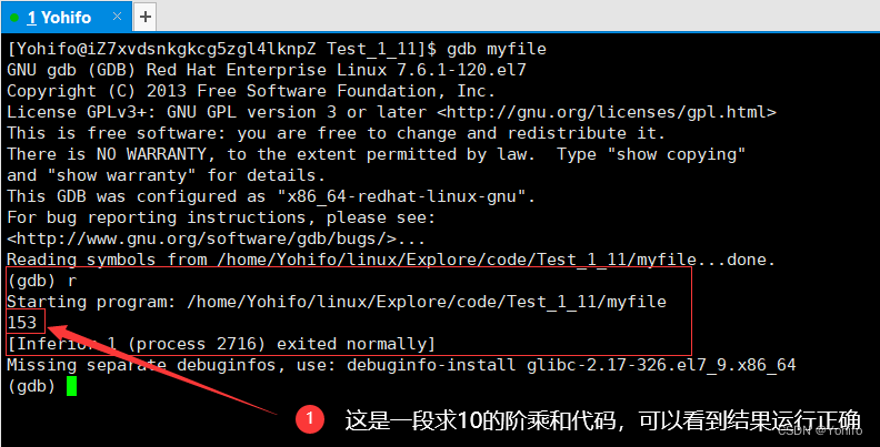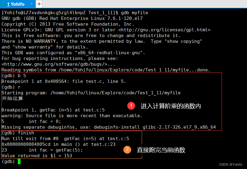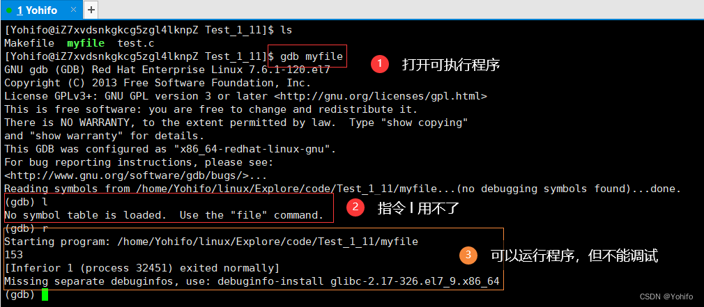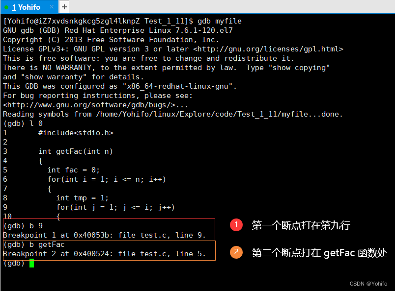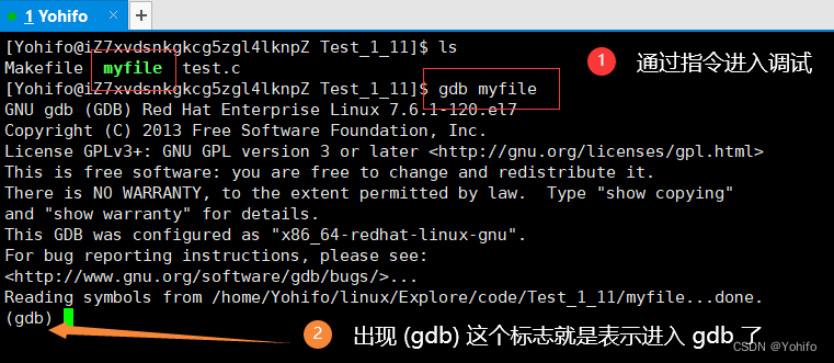 然后通过指令 gdb myfile 即可进入调试