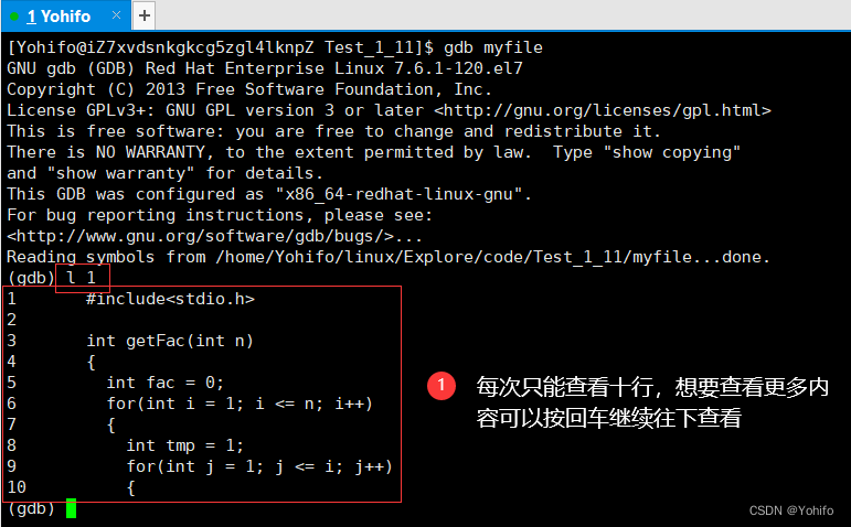 l 命令一般是配合数字进行查看,每次只可查看十行,如 l 1 就表示从代码第一行开始查看其前后十行,按回车后可接着往下展示,直到代码展示完毕
