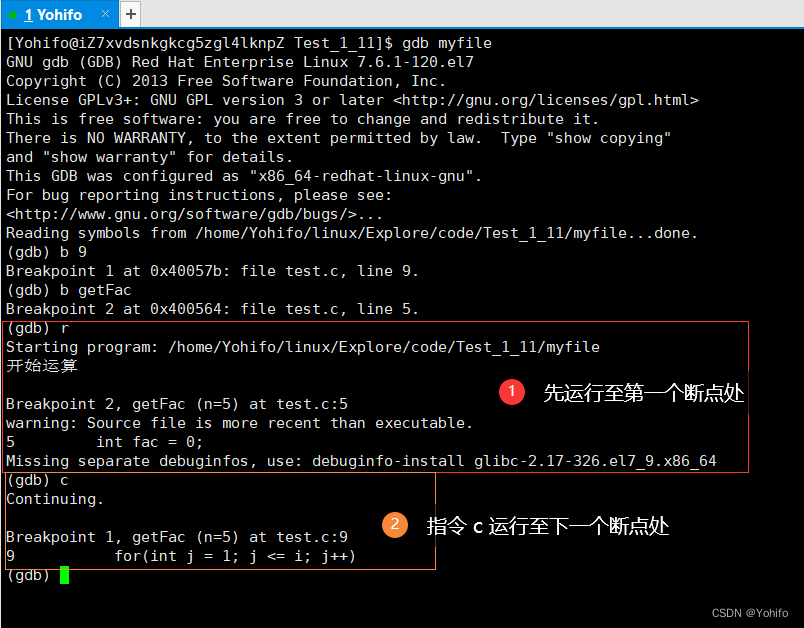 (gdb) c //进行断点间的跳转