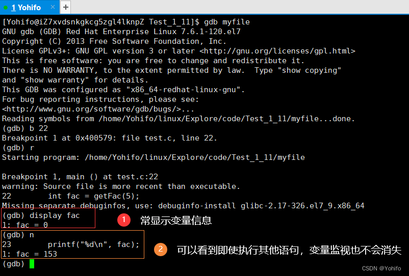 (gdb) display 变量 //常显示变量信息,不会随着指令的执行而消失
