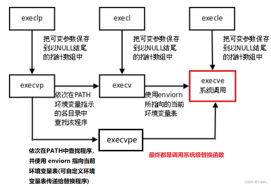 execve 是系统真正提供的程序替换函数,其他替换函数都是在调用 execve
