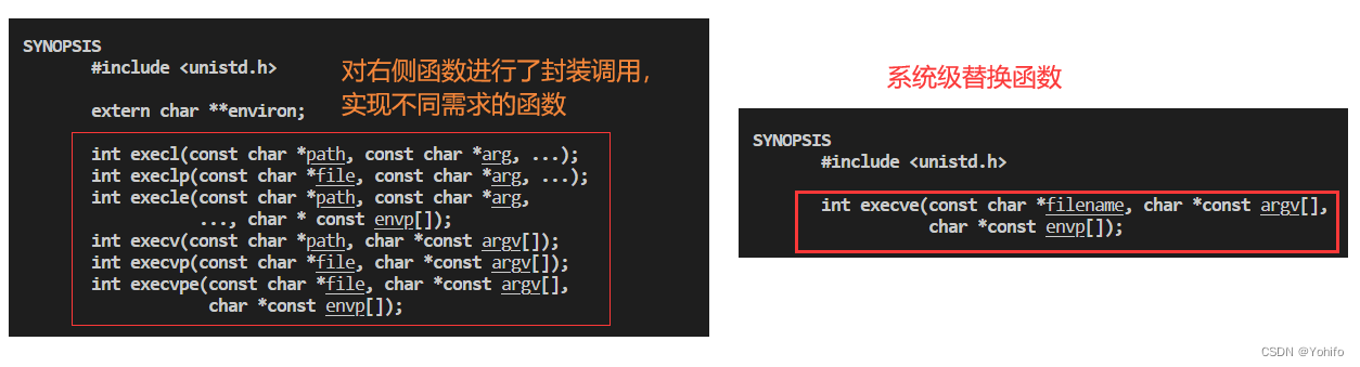 execl 相当于将链式信息转化为 argv 表,供 execve 参数2使用execlp 相当于在 PATH 中找到目标路径信息后,传给 execve 参数1使用execle 的 envp 最终也是传给 execve 中的参数3#include <unistd.h>