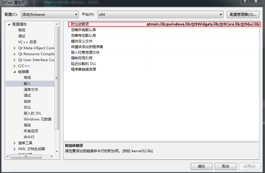 附加依赖项改成:qtmain.lib;qwindows.lib;Qt5Widgets.lib;Qt5Core.lib;Qt5Gui.lib;Qt5PlatformCompositorSupport.lib;Qt5EventDispatcherSupport.lib;Qt5FontDatabaseSupport.lib;Qt5ThemeSupport.lib;Qt5WindowsUIAutomationSupport.lib;qgif.lib;qicns.lib;qico.lib;qjpeg.lib;qsvg.lib;qtga.lib;qtiff.lib;qwbmp.lib;qwebp.lib;qtfreetype.lib;qtharfbuzz.lib;qtlibpng.lib;qtopenwnn.lib;qtpcre2.lib;qttcime.lib;winspool.lib;shlwapi.lib;rpcrt4.lib;comdlg32.lib;oleaut32.lib;imm32.lib;winmm.lib;glu32.lib;opengl32.lib;gdi32.lib;kernel32.lib;user32.lib;shell32.lib;uuid.lib;ole32.lib;advapi32.lib;ws2_32.lib;mpr.lib;%(AdditionalDependencies)