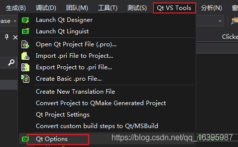 点击菜单栏上的“Qt VS Tools > Qt Options”打开Qt选项窗口;