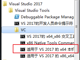 在开始菜单中,找到“适用于 VS 2017 的 x64 本机工具命令提示“ 或者 “x64 Native Tools Command Prompt for VS 2017”。