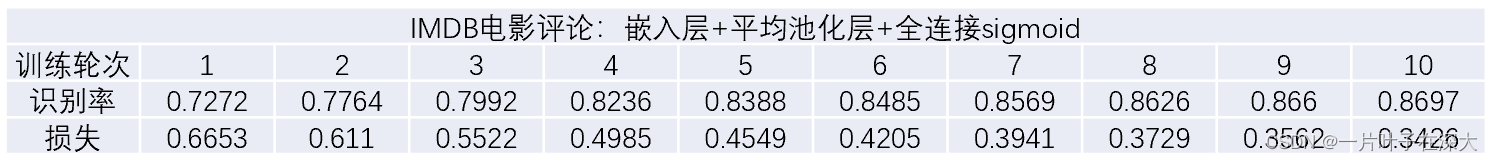我们构建一个包含嵌入层、全局平均池化层和输出层的神经网络,输入数据是一组英文电影评论,输出结果是二分类标签,即正面评价或负面评价。