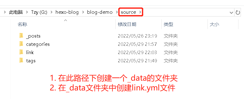 ---前往Hexo博客目录(【BlogRoot/source/_data】)创建一个文件link.yml(如果沒有 _data 文件夹,请自行创建)。