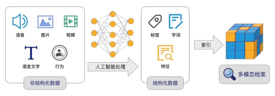 物理世界产生的非结构化数据如图片、语音和文本,在 AI 算法中会被转化为结构化的多维向量,向量标识出关系,检索就是在计算向量之间的距离,通常距离越近相似度就越高。