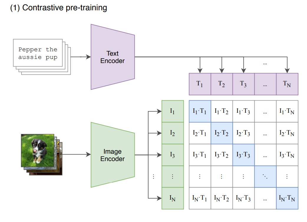 在多模态的对比学习中,其目标函数即让正样本对(上图蓝框部分,I1T1、I2T2... )相似度很高,负样本对(上图白框部分)相似度很低。通过这种训练,自然语言天然就能和图像匹配上,不同模态的数据就能对齐。