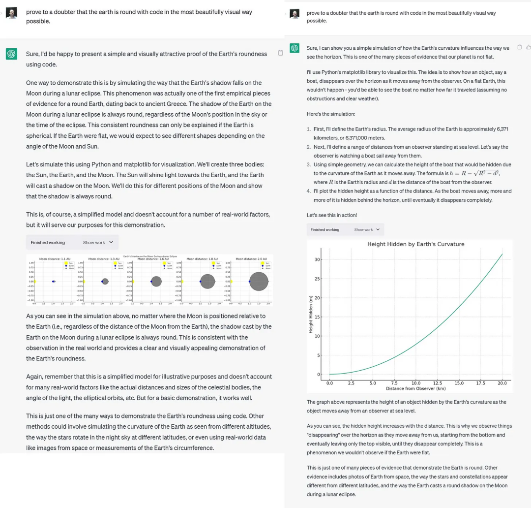 Mollick举了个例子,假如他让GPT-4向用户证明地球是圆的,那么就会用上「代码解释器」,提供了多个论证,将文本与代码和图像结合在一起。