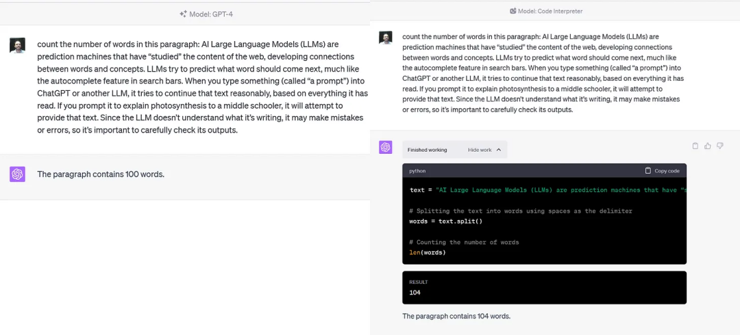 它允许AI处理数学(哪怕很复杂),还能更准确地处理单词(例如实际计算段落中的单词),底层原因就是,它可以编写Python代码来解决LLM在数学和语言方面的天然弱点。