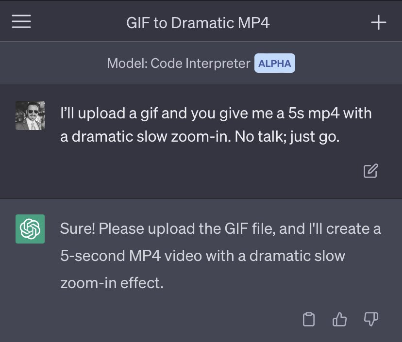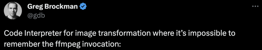 联合创始人Greg Brockman转发称,在不可能记住ffmpeg调用的情况下,用于图像转换的代码解释器。