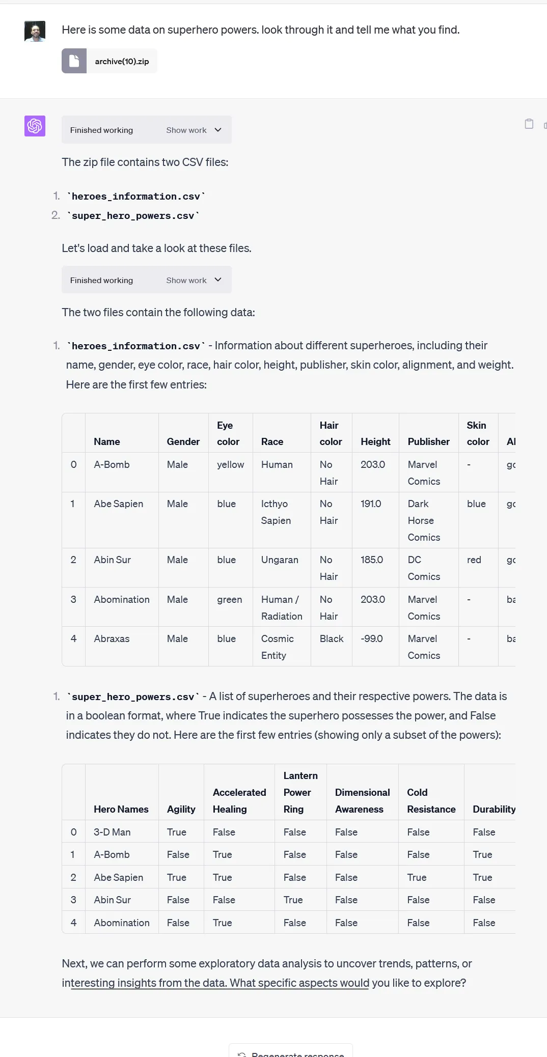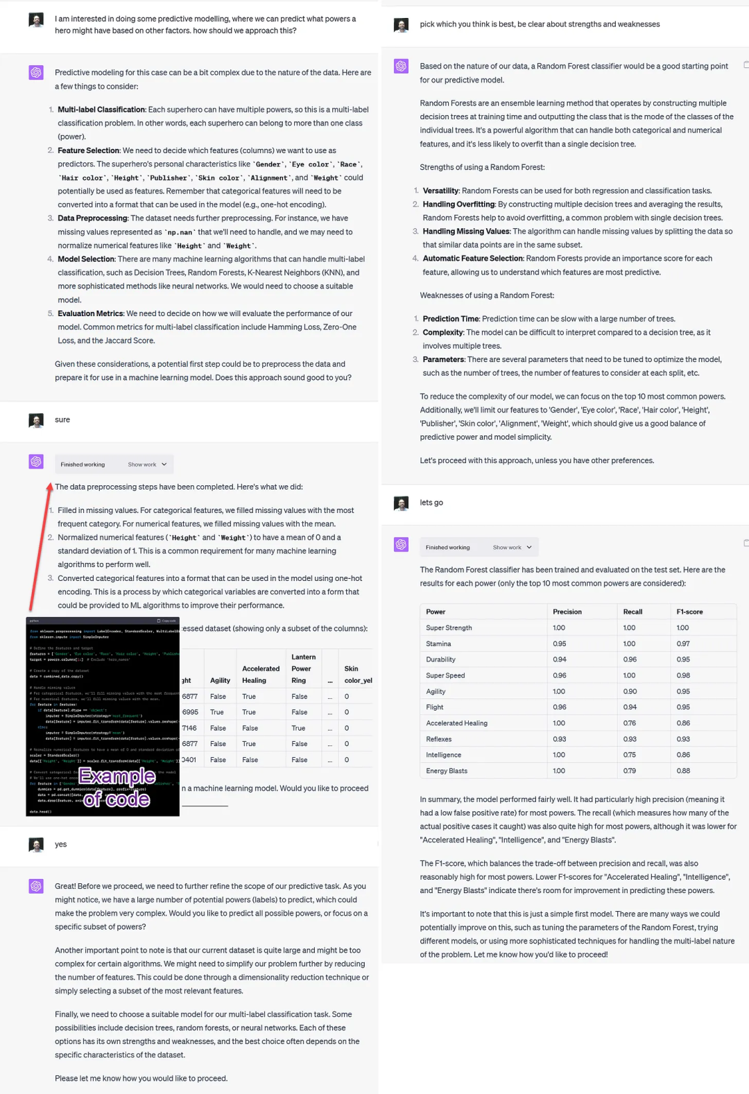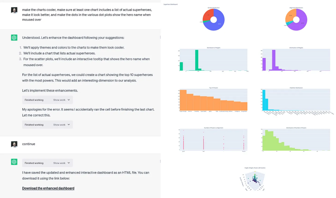 紧接着Mollick实操了一下,他让「代码解释器」搞个预测建模出来,预测超级英雄可能会有什么超能力。