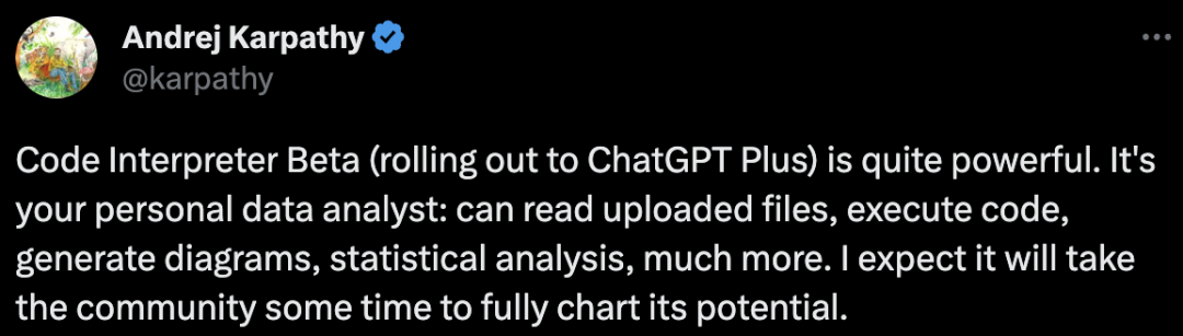 OpenAI的科学家Karpathy对此还宣传了一波,代码解释器测试版相当强大。