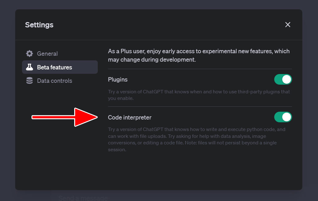 第一步:打开「代码解释器模型」。要启用它,请进入设置 -> 测试版功能 -> 代码解释器。