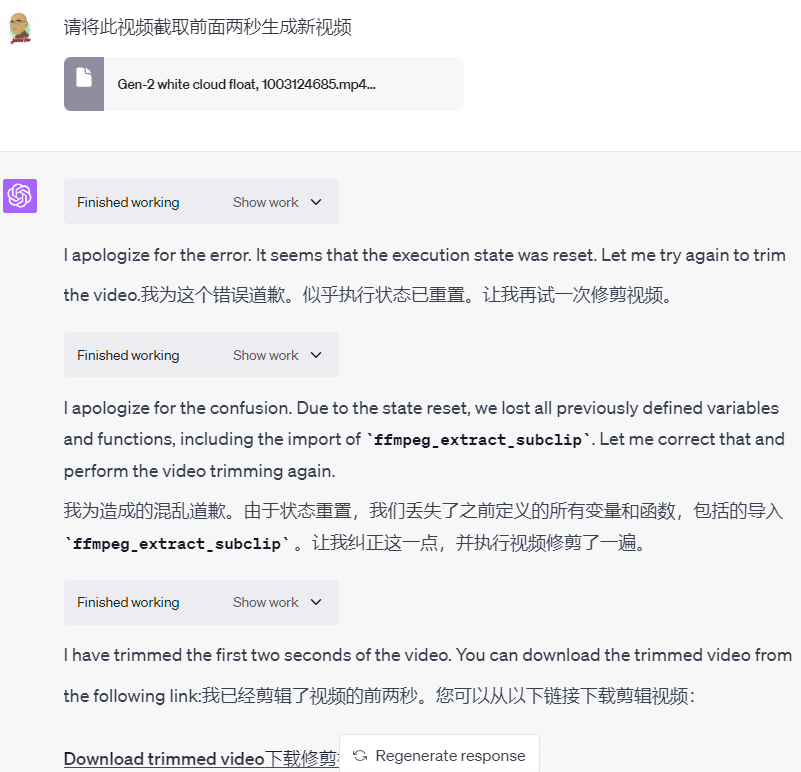 「有一定内存容量限制,不过处理小文件是没问题了。刚扔给TA 4秒钟的gen-2视频,截取前两秒,没问题,迅速搞定。